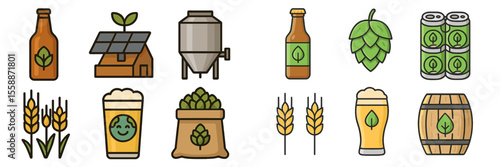 Collection of modern beer icons featuring bottles, glasses, hops, and brewing equipment in vector style