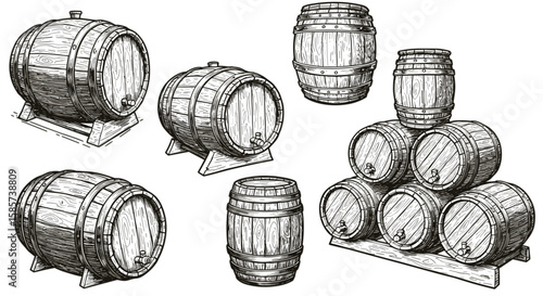 Illustration of wooden barrels in various sizes, showcasing traditional craftsmanship and design elements in a rustic style