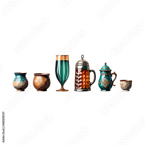 Craft Beverage Composition: An artistic illustration showcasing diverse glassware and a brew kettle, celebrating the art and craft of beer making.