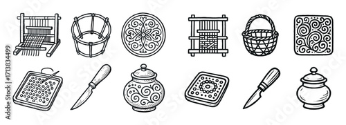 A collection of minimalist outline icons illustrating various winter crafts and creative hobbies, featuring elements such as knitting, sewing, wood carving, pottery, and crafting tools like scissors a