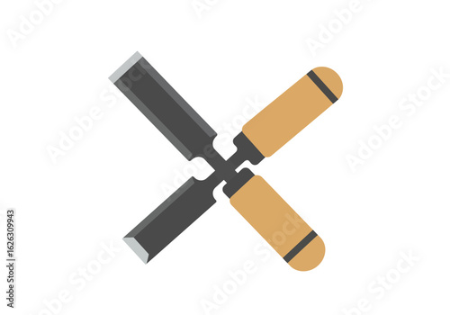 Isometric illustration of woodworking tools including chisels, mallet, and carved wooden blocks for craft, carpentry, and wood sculpture design