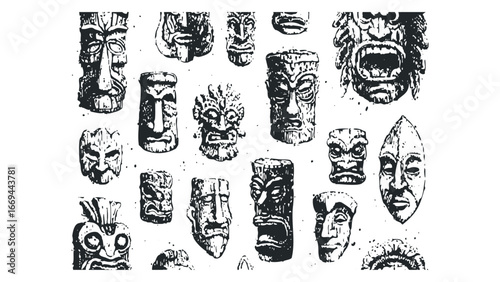 Fearsome Tiki Totem Guardians Displayed, Ancient Tribal Mask Spirit Protector for Summer Luau Celebration, Polynesian Culture, South Pacific Mythology, Wood Carving Art, Traditional Decoration & Tatto