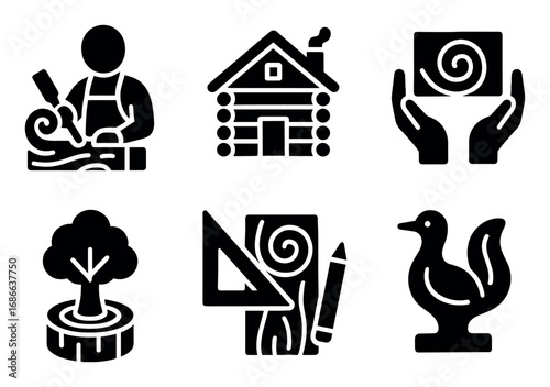 Wood Carving Icons. Solid style icons of wood carving: chip carving knife, relief panel, whittled figure, gouge chisel, carving