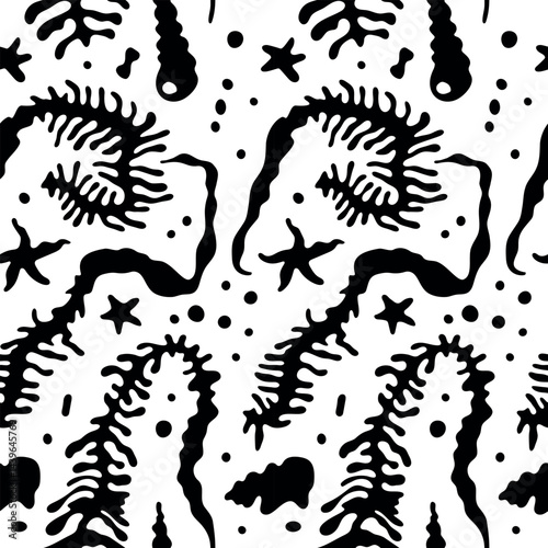 Bannière ou affiche composée de produits de la mer, mollusque, crustacé, poisson et algues pour former une illustration blanche et noire pour décorer votre restaurant ou votre poissonnerie.