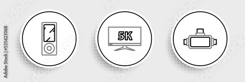 Set line Virtual reality glasses, Music player and Monitor display with 5k video icon. Vector