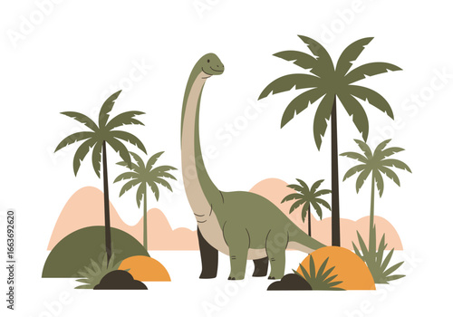 Cute cartoon Brachiosaurus dinosaur with a long neck standing in a prehistoric landscape with palm trees and mountains.