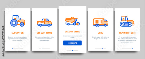 Agricultural Vehicles Vector Onboarding Mobile App Page Screen. Agricultural Transport, Harvesting Machinery Linear Pictograms. Harvesters, Tractors, Irrigation Machines, Combines Illustration