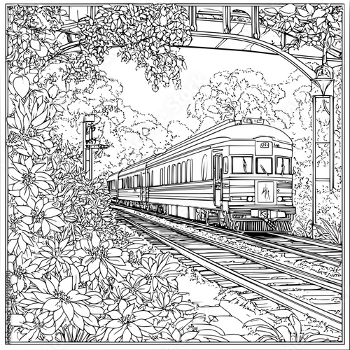 A silhouette of a train at a modern station platform in minimalist black and white vector style, ideal for urban transport graphics