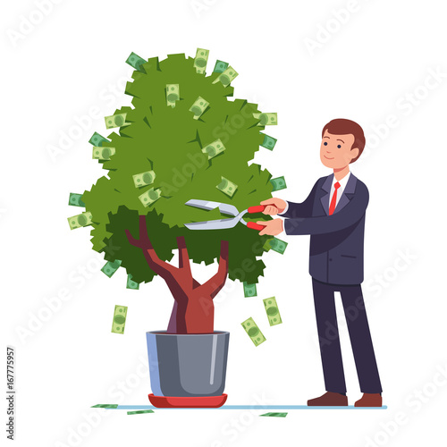 Scissors cutting money bill in flat style. Price, cost reduction or cut price. Vector stock illustration.