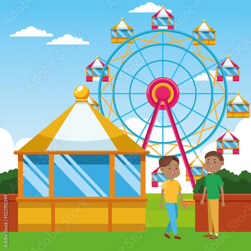 Amusement park with attractions, carousels, circus tent vector illustration in flat design