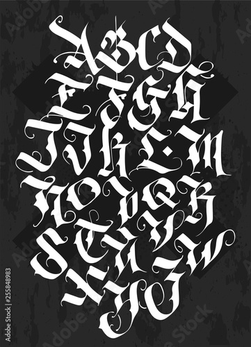 Gothic font. Full set of letters of the English alphabet in vintage style. Medieval Latin letters. Vector calligraphy and lettering. Suitable for tattoo, label, headline, poster, etc.