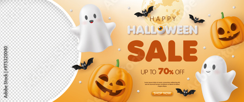 Happy Halloween sale banner with pumpkins, stars and bats on orange background 2025
