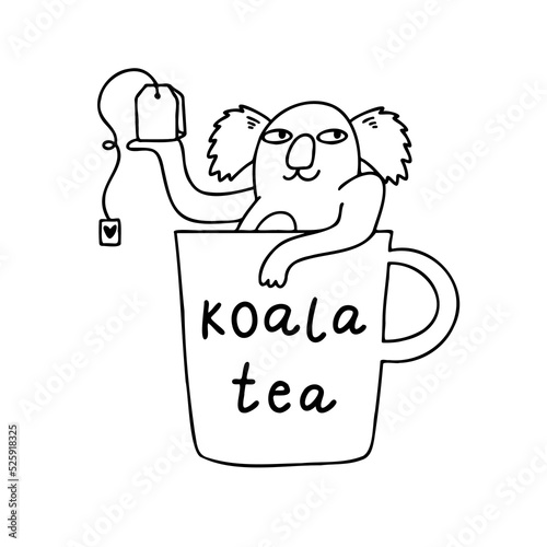 Cute koala bear eat eucalyptus leaves. Printable coloring page. Vector black and white illustration.