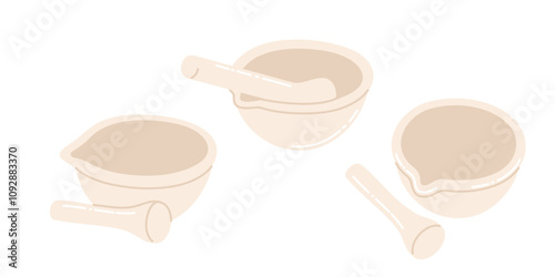set of mortar and pestle vector illustrations, herbal medicine preparation and culinary spice grinding
