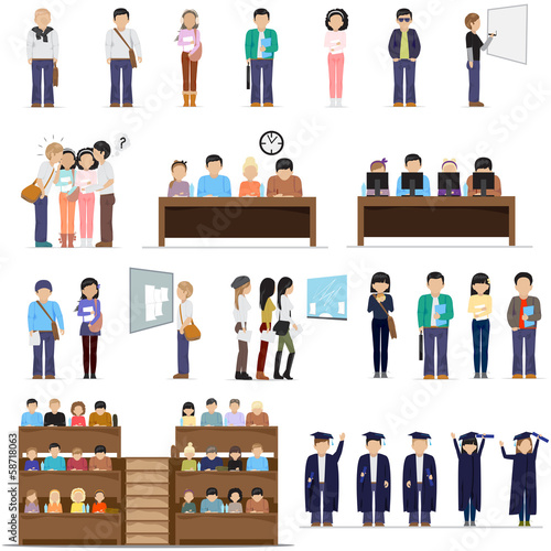 University students life set. Happy young girls and boys listening lecture in classroom, studying in library and preparing for exam. Flat vector illustration collection isolated on white background