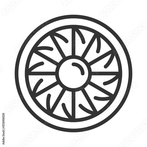 Detailed black and white vector illustration of a jet engine turbine. Complex mechanical parts and precision design showcase aviation technology. Ideal for aerospace engineering visuals.