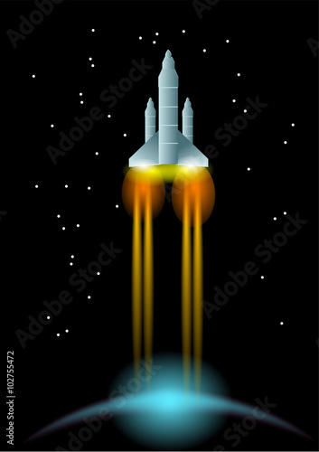 Rocket launch with smoke trail, retro spacecraft blasting off, dynamic astronomy exploration graphic