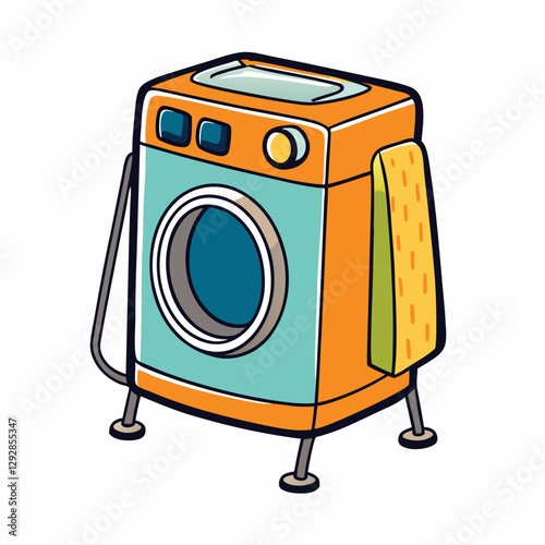 Laundry day illustration showcasing a washing machine, detergent, iron and stacked fabrics