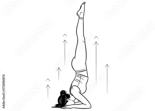Woman in Shoulder Stand, Salamba Sarvangasana. A therapeutic yoga inversion for balance and calm. Minimalist line art vector with upward arrows for wellness.
