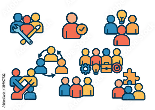 Harmonious Study Icons. Flat vector icons of calm academic teamwork: people studying in sync, shared table with open notebooks,