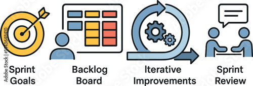 Render agile workflow with sprint goals, backlog board, iterative improvements, and sprint review. Vector illustration, well-structured and visual, no text, transparent background