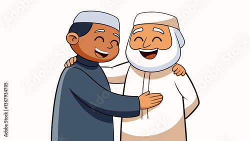 Happy Eid celebration, Vector graphic illustration. Indian Muslim young boy hugging and wishing each other. Eid ul-Fitr, Eid ul-Adha. Religious holiday.
