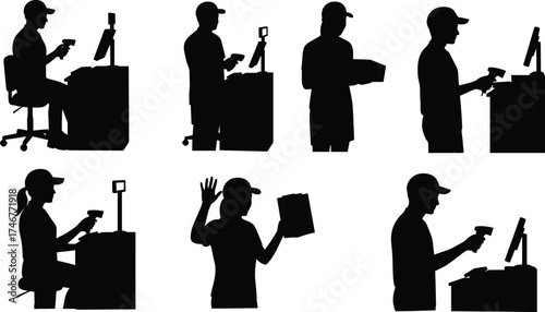 Warehouse scanner, retail monitor, barcode scanning, inventory management, silhouette workers, digital workflow, logistics technology, vector illustration, workplace activity icons