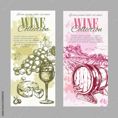 Vineyard landscape sketch vector illustration. Red wine bottle, glasses, grape vine, hand drawn label design elements