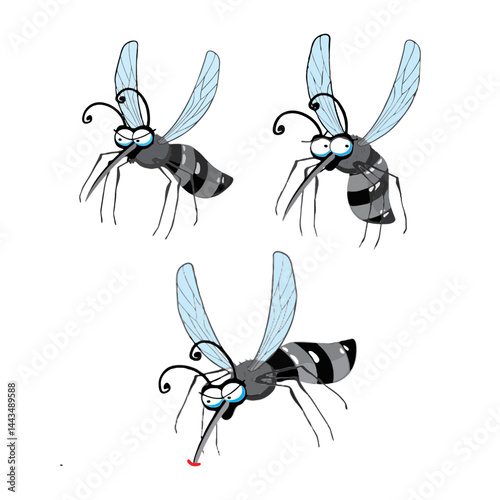 Cute cartoon mosquito character vector illustration set, funny flying insect mascot with different emotions and actions, health, disease, nature concept, isolated on white.