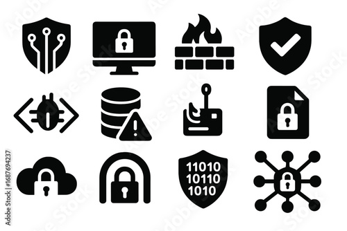 Cyber ​​security icon. Includes security, phishing alert, antivirus, cyber attack, password security. Solid vector icon set.