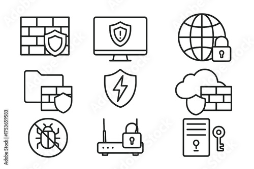 Cybersecurity and network technology icons set with firewall and lock symbols