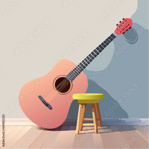 Red acoustic guitar on a yellow background. Nearby there is an empty space for text or copy space.