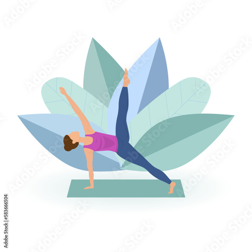 Kid Yoga Classes. Female Instructor Teaching Children Asana Balance Position Vector Illustration. Health Care Physical Education. Gymnastics Lesson Fitness Exercise. Sport Training