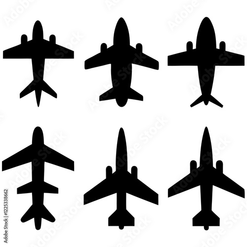 A set of simple, black silhouette airplane icons in various views (front, side, top).
