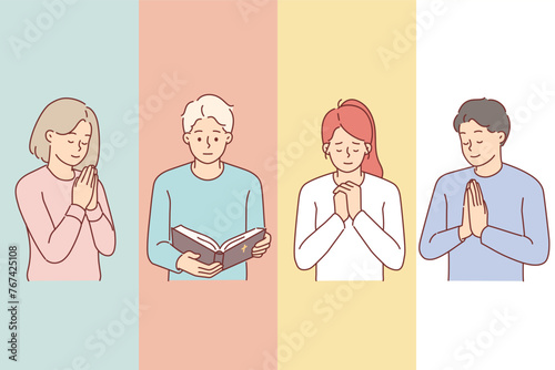 Watercolor religious symbols and icon set with praying figures and amen text vector icon isolated illustration