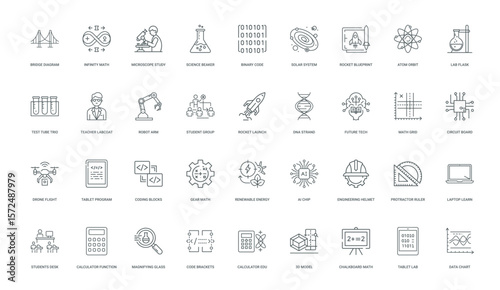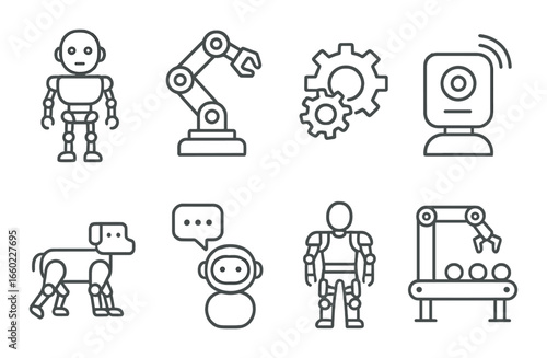 Industrial robot, icon set. Mechanical hydraulic robotic arm for manufacturing, linear icons. Line with editable stroke