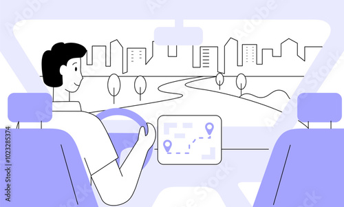 Illustration featuring a person driving a modern compact car with minimalist aesthetic design for transportation concepts