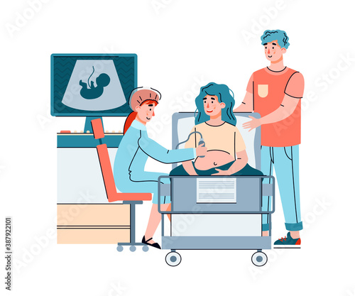 Pregnant woman have ultrasound in clinic. Couple doing consultation and check up pregnancy with doctor. Vector cartoon illustration