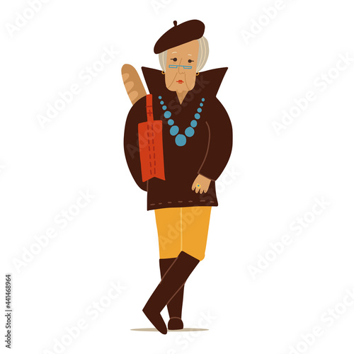 Portrait of an old woman in a beret and sunglasses. Avatar cheerful pensioner. Vector illustration