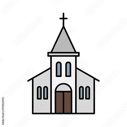 A simple line art icon shows a christian church building on white background