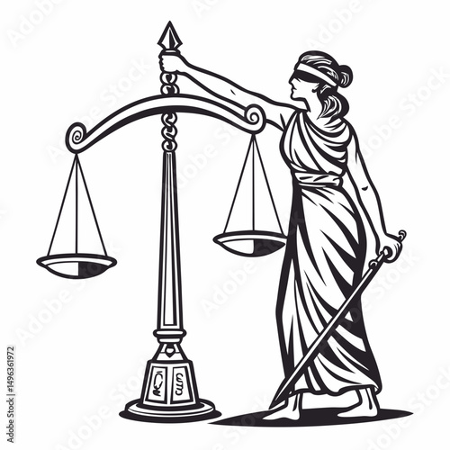 A depiction of Lady Justice holding scales and a sword in outline vector style, suitable for legal themes and justice-related projects