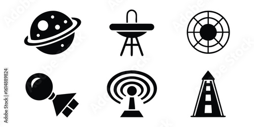 Vector art of icons depicting celestial bodies and advanced technology, including planets, satellites, and radar.
