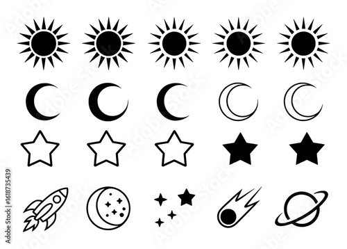 Collection of stylized celestial bodies including suns moons planets galaxies and comets in a black and white graphic design