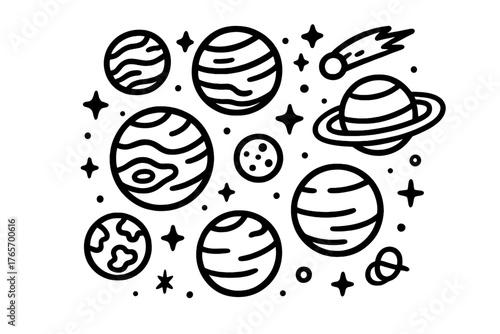 Whimsical hand drawn planets and celestial bodies in a doodle style