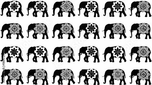 Black elephants with white floral designs on their bodies arranged in a seamless repeating pattern design | editable eps vectors silhouette