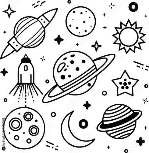 Monochrome space elements isolated on white background, featuring planets, stars, rockets, and celestial bodies