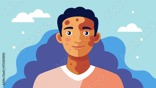 A commercial featuring a man with vitiligo confidently posing against a plain background with the words No two bodies are the same and thats what makes us beautiful.. Vector illustration