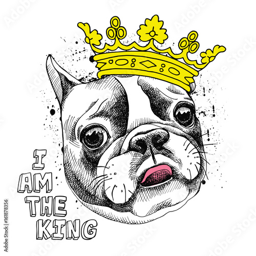 Image Portrait of French bulldog in a yellow crown. Vector illustration.