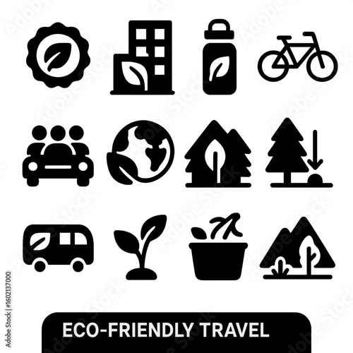 Flat vector icons of eco-transport options: bike commuting badge, electric scooter sharing app, carpooling badge, public transport eco map, walking to work badge, EV car charging station, sustainable