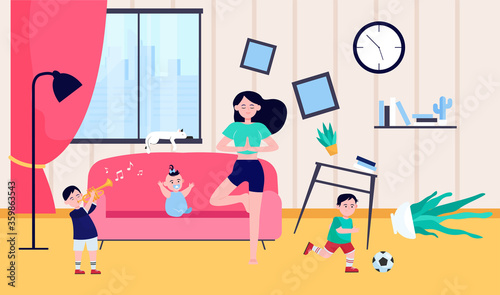 Nervous mom and kids. Mother mom is angry with running naughty, mischievous children creating chaos in home. Vector kids characters. Mother parent and naughty boy and girl illustration